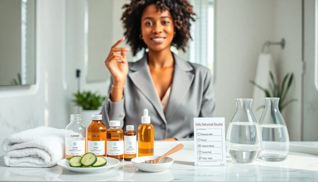 - Follow a daily natural skincare routine including gentle cleansing twice daily, light exfoliation twice weekly, and moisturizing with non-comedogenic products matching your skin type for clear skin naturally.